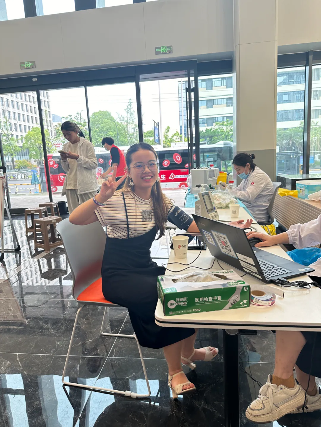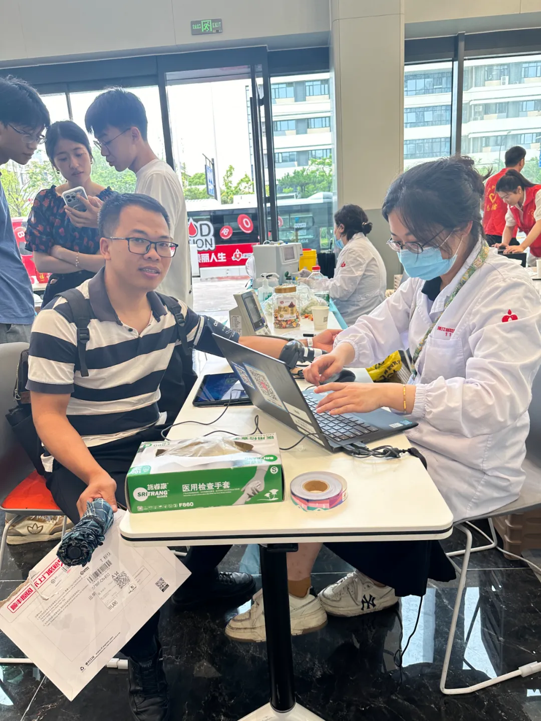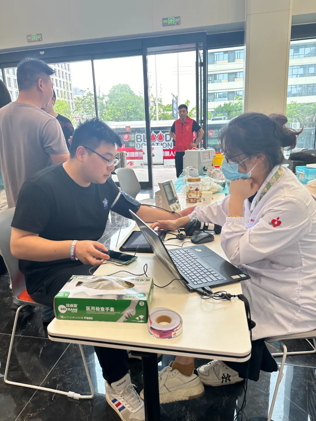 献血的同事们在党员志愿者的热心帮助下,有序进行体检、验血、抽血等流程,整个献血现场温馨且融洽。